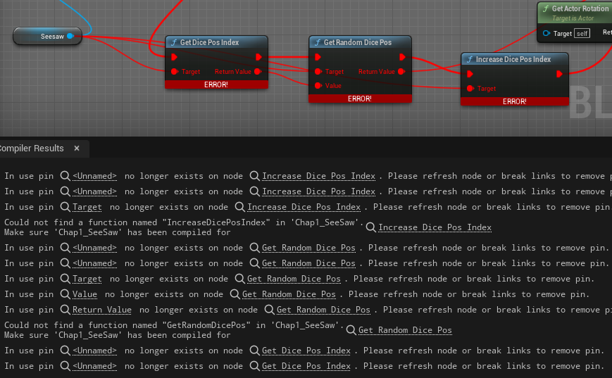 위의 컴파일에러들은 Chap1_SeeSaw를 상속받는 Seesaw BP 클래스를 Object Reference로 지정해주고 Chap1_SeeSaw 클래스에 구현되어 있는 BlueprintCallable함수들을 불러왔지만 언리얼 상의 에러로 인해 계속 연결이 끊기는 상황을 캡쳐한 모습이다.