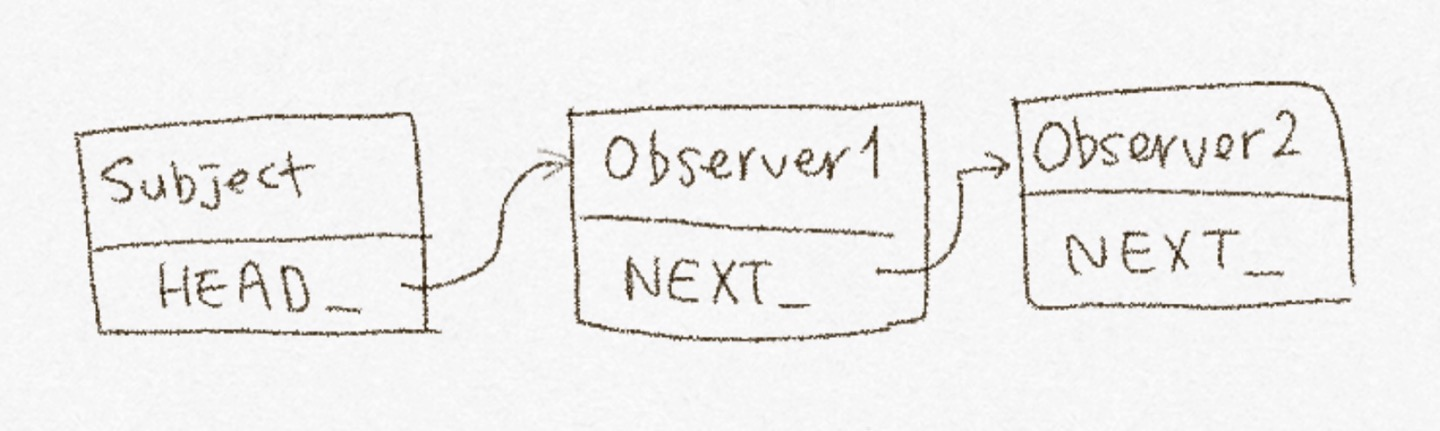 이 대신, Observer에 next_를 만들어 관찰자들끼리 엮을 수 있게 만드는 것이다.