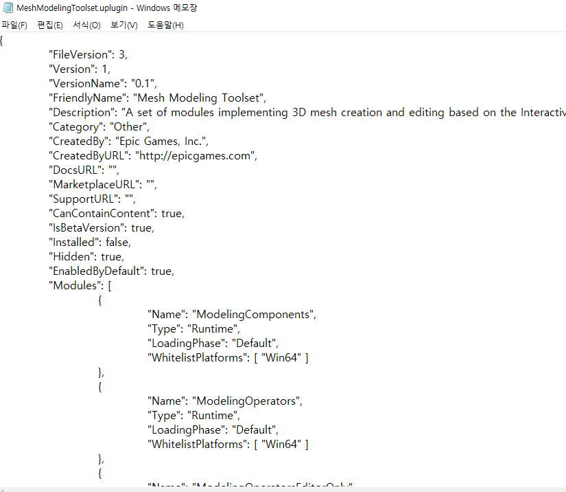 이 경우에는 C:\Program Files\Epic Games\UE_4.26\Engine\Plugins\Experimental\MeshModelingToolset 이 경로로 들어가게 될 것이고, 여기서 .uplugin 파일 확장자를 열어준다.