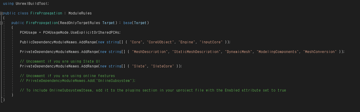 프로젝트를 본인이 사용하고 있는 IDE로 열어주고, Build.cs 파일을 확인한다. ({ProjectName}.Build.cs)