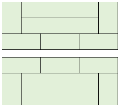 먼저 생각할 수 있는 경우의 수는 3 x 2 크기의 벽 두 개로 3 x 4 벽을 나타낼 수 있다는 것이다.