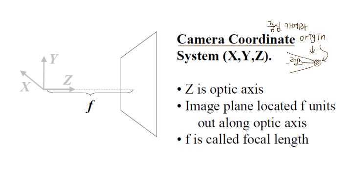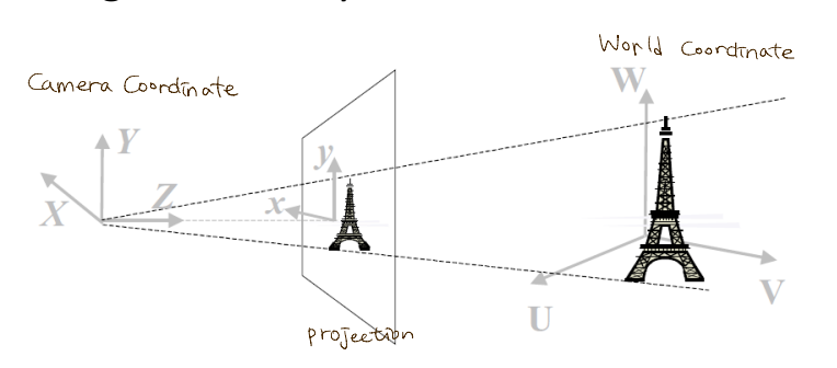 위 그림은 물체의 카메라 상으로 Camera Coordinate System을 나타낸 모습이다.