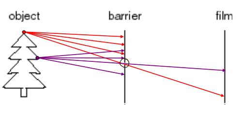 그럼, 한 곳에서 반사되는 여러 방향의 빛 중 해당 구멍으로 지나가는 빛만 Film에 도달한다.