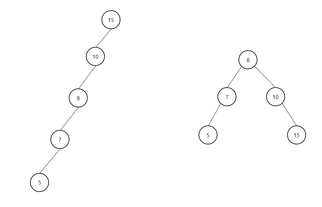 위 그림에서 왼쪽 트리와 오른쪽 트리를 비교해보면, 오른쪽 트리가 더 균형이 잡혀있다고 할 수 있다.